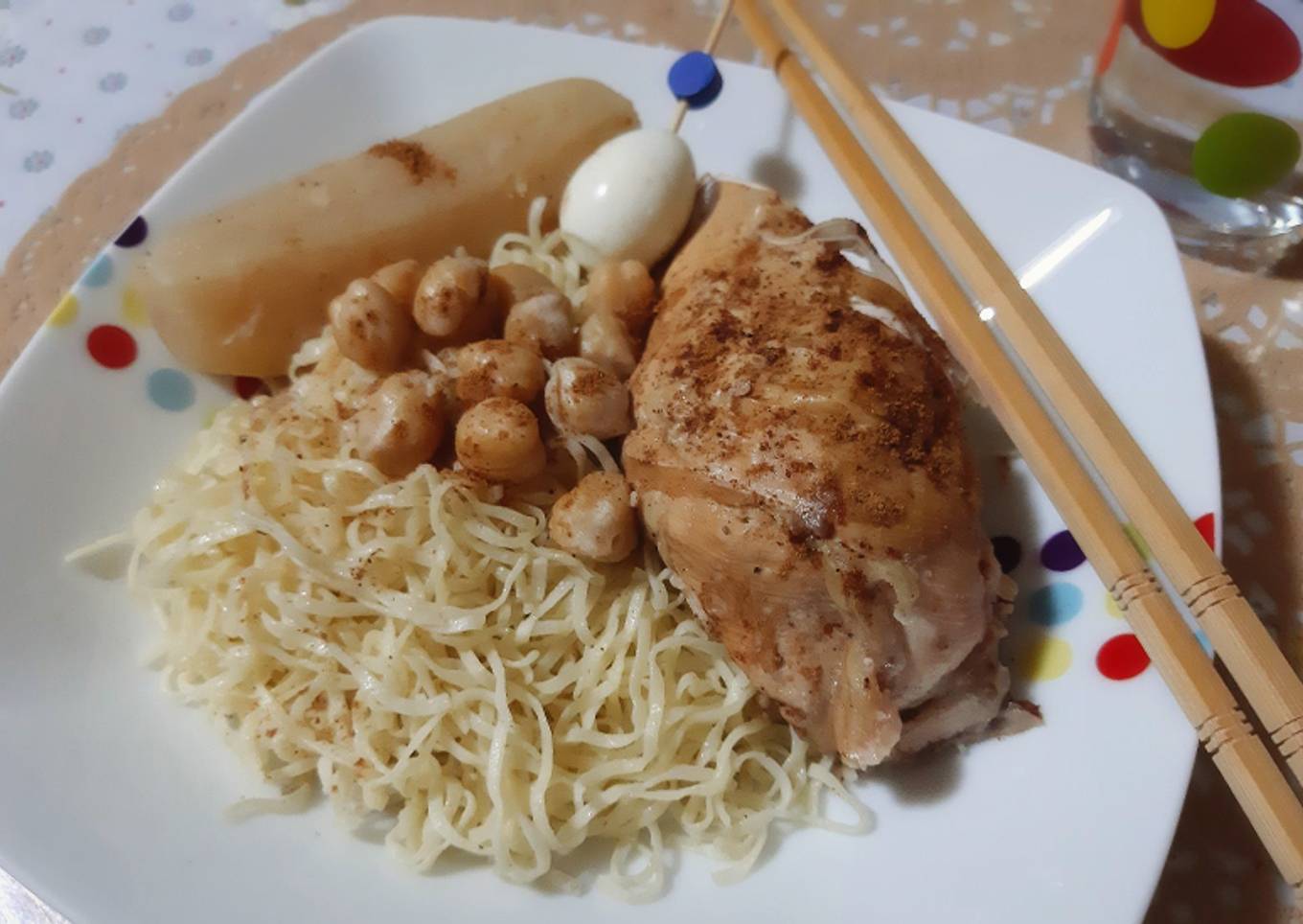 - Servez les pâtes en les accompagnant de poulet,navets, pois chiche, oeufs durs et de sauce, sans oublier de parsemer de cannelle.