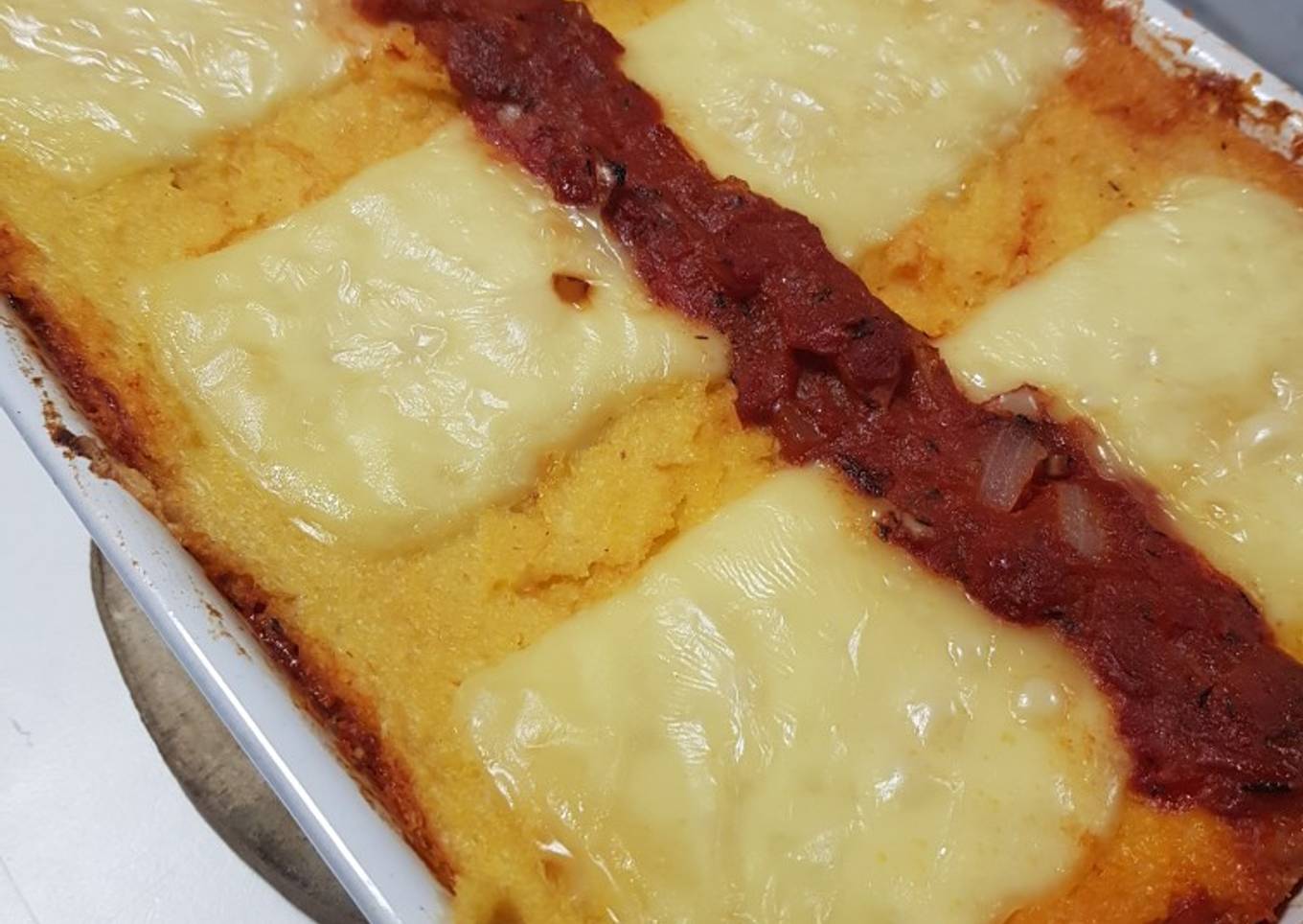 - Remplissez le fond avec une couche de polenta puis une couche de sauce tomate et du fromage à raclette puis de nouveau la polenta et la sauce jusqu'à ce qu'il y en ait plus en finissant par le fromage 😊